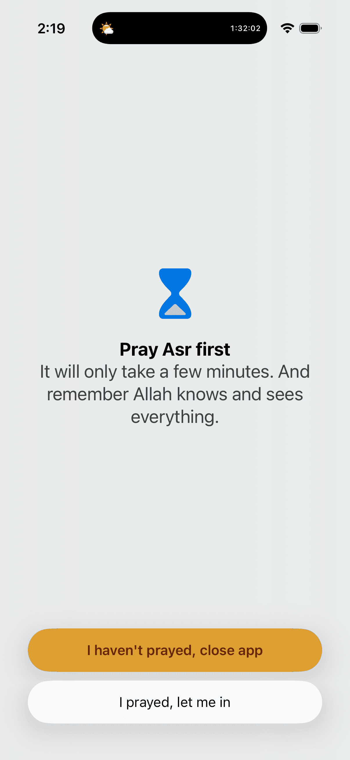 I love that it doesn't nag me constantly but still holds me accountable. My screen time on Instagram has dropped and my khushu has improved. It's rare to find an app that actually helps you be less on your phone. Five stars.