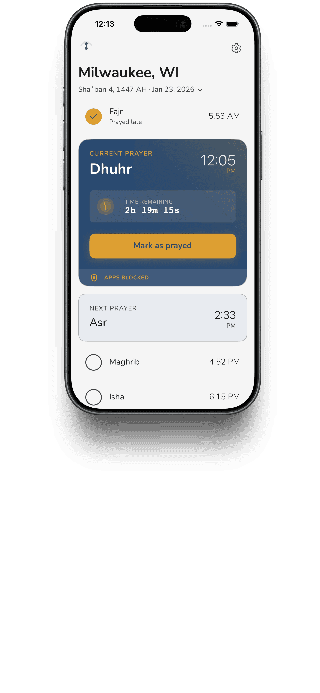 You've tried the reminders. You've set the alarms. You still find yourself scrolling when you should be praying. Asr is different. When prayer time arrives, your distracting apps are blocked. Not hidden, not muted, actually blocked. No willpower required.